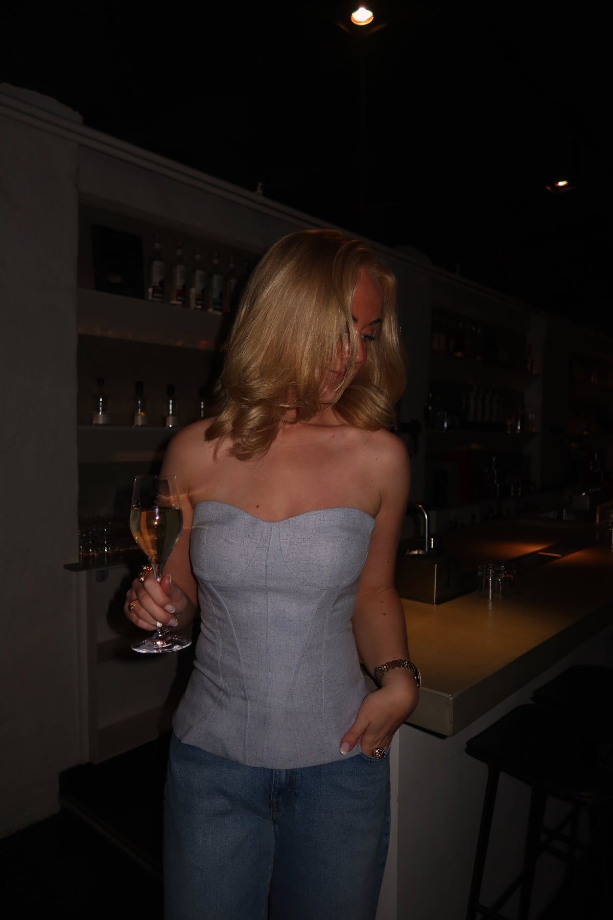 Elegant og tidløs bandeau top med en smuk, figursyet pasform, der fremhæver silhuetten på en sofistikeret måde. Toppen har et struktureret design med synlige syninger og en let formet udskæring, der giver støtte og et flatterende look. Fremstillet i et eksklusivt materiale med en let tekstur, som giver et moderne og stilrent udtryk.