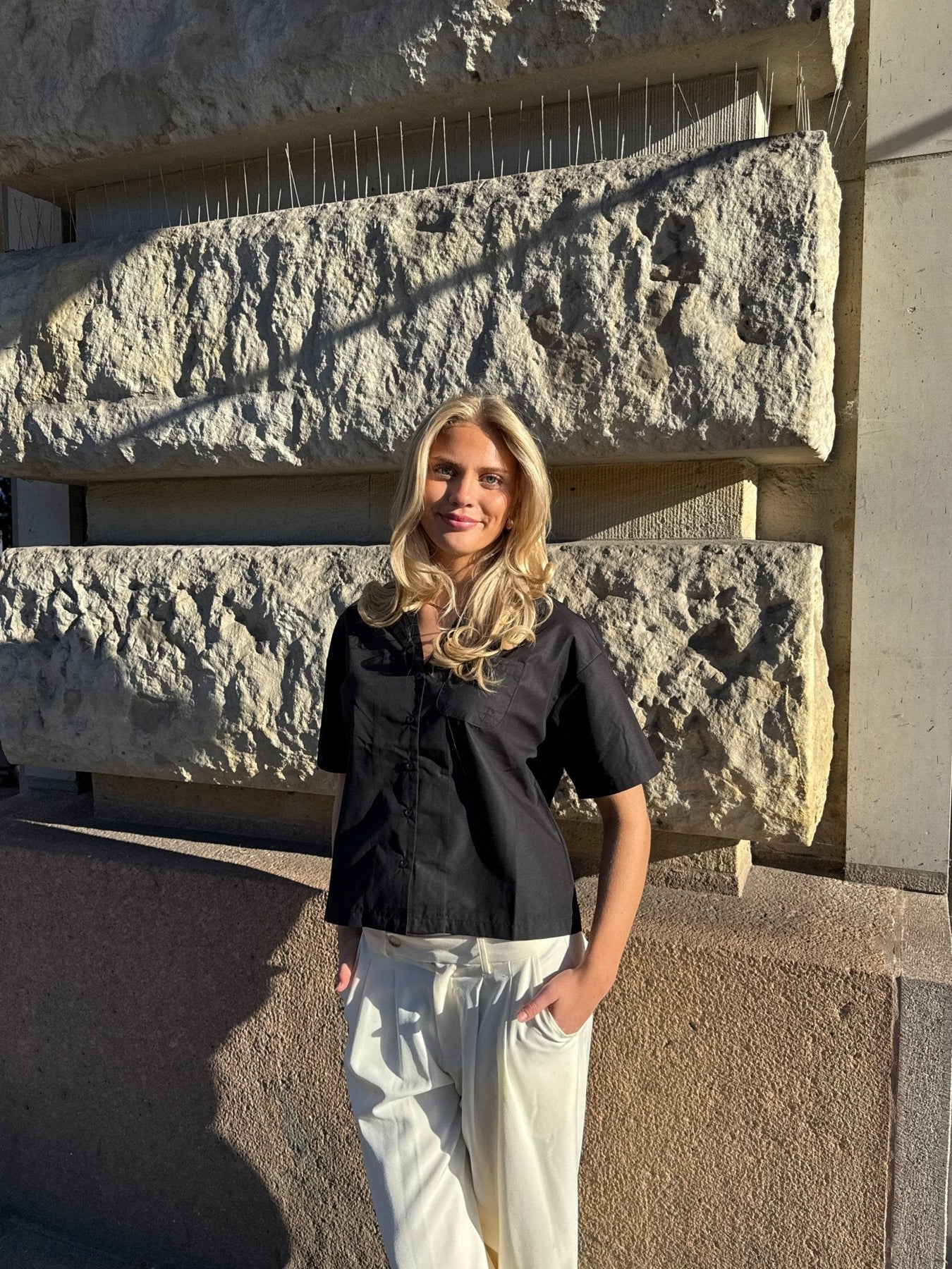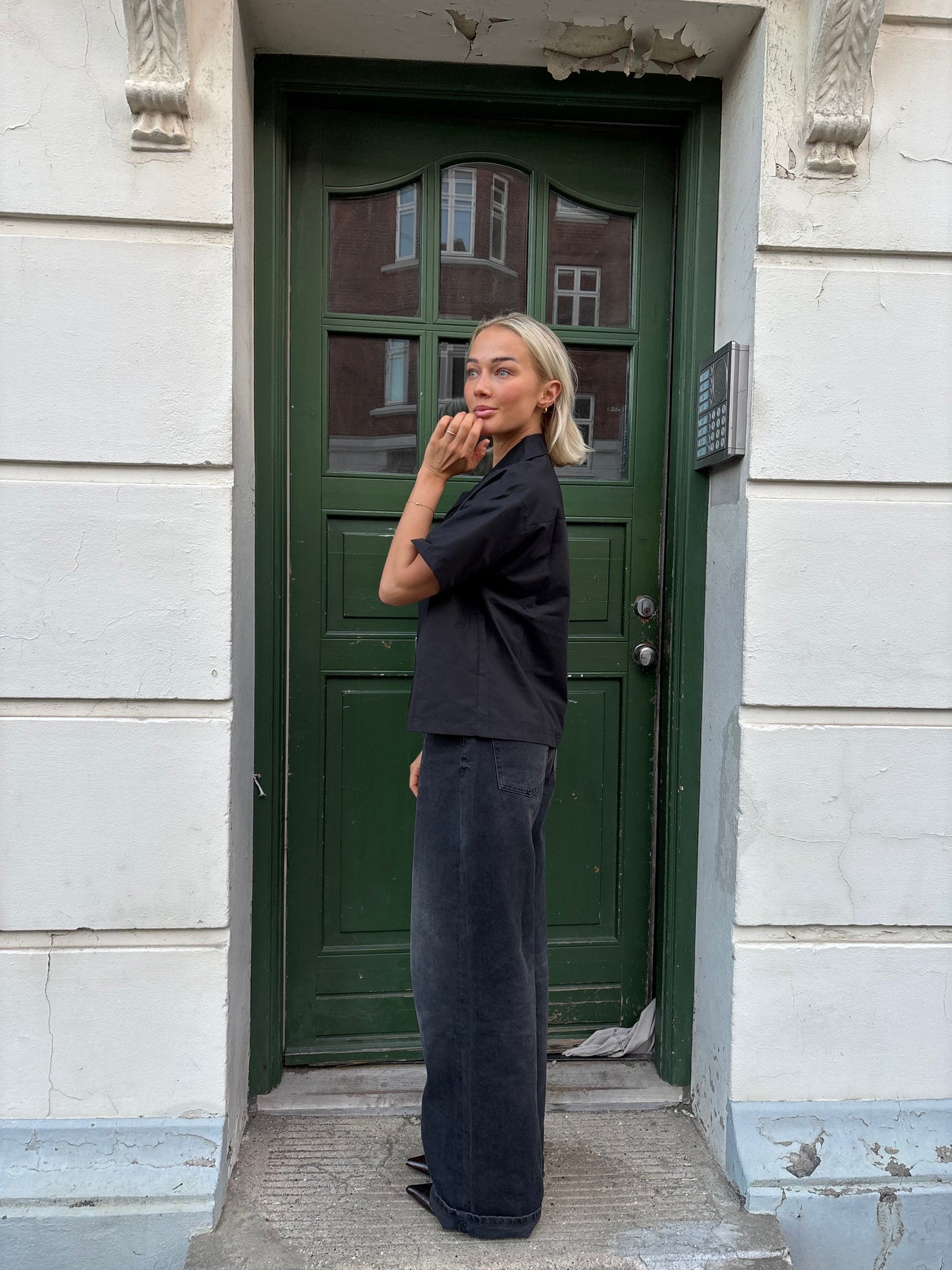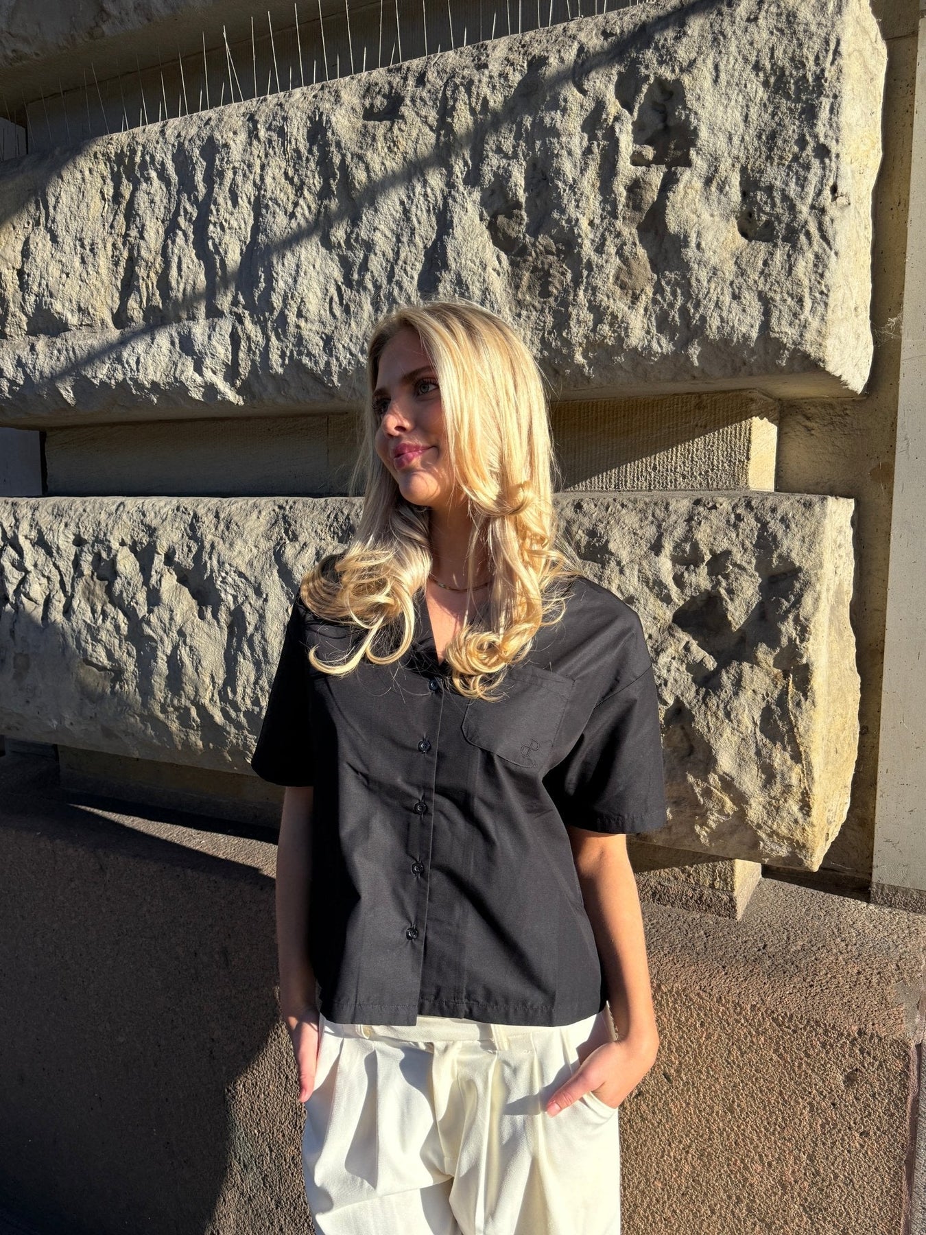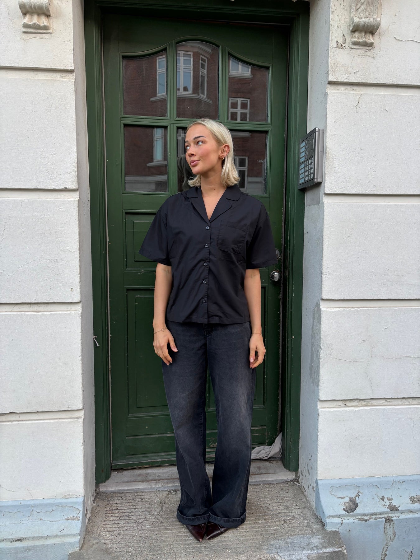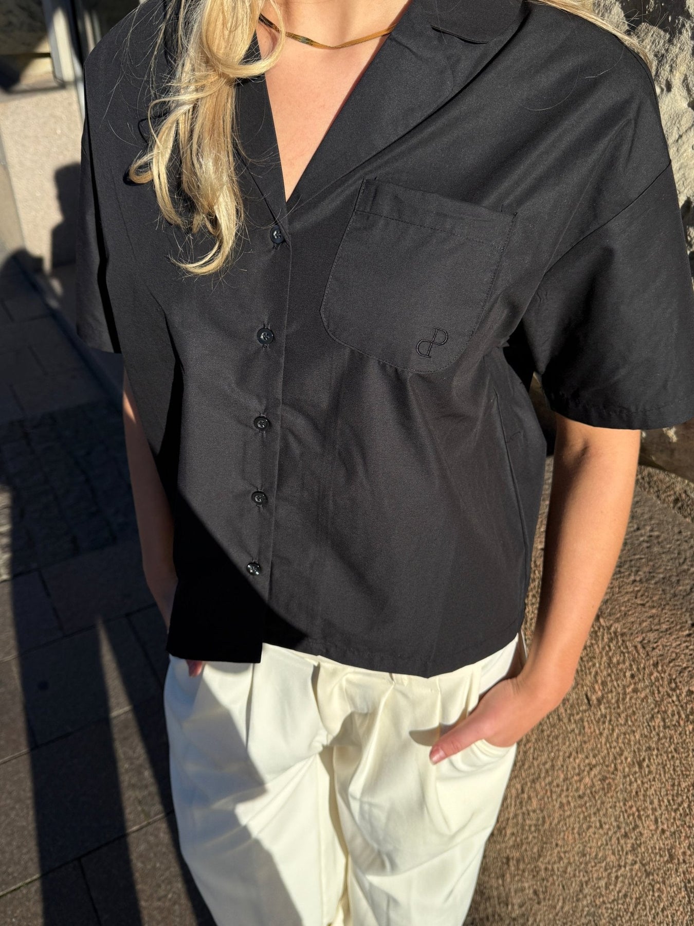 Den her sorte kortærmede skjorte er både let, luftig og super stilet. Den har en klassisk og afslappet pasform, der gør den perfekt til varme dage.