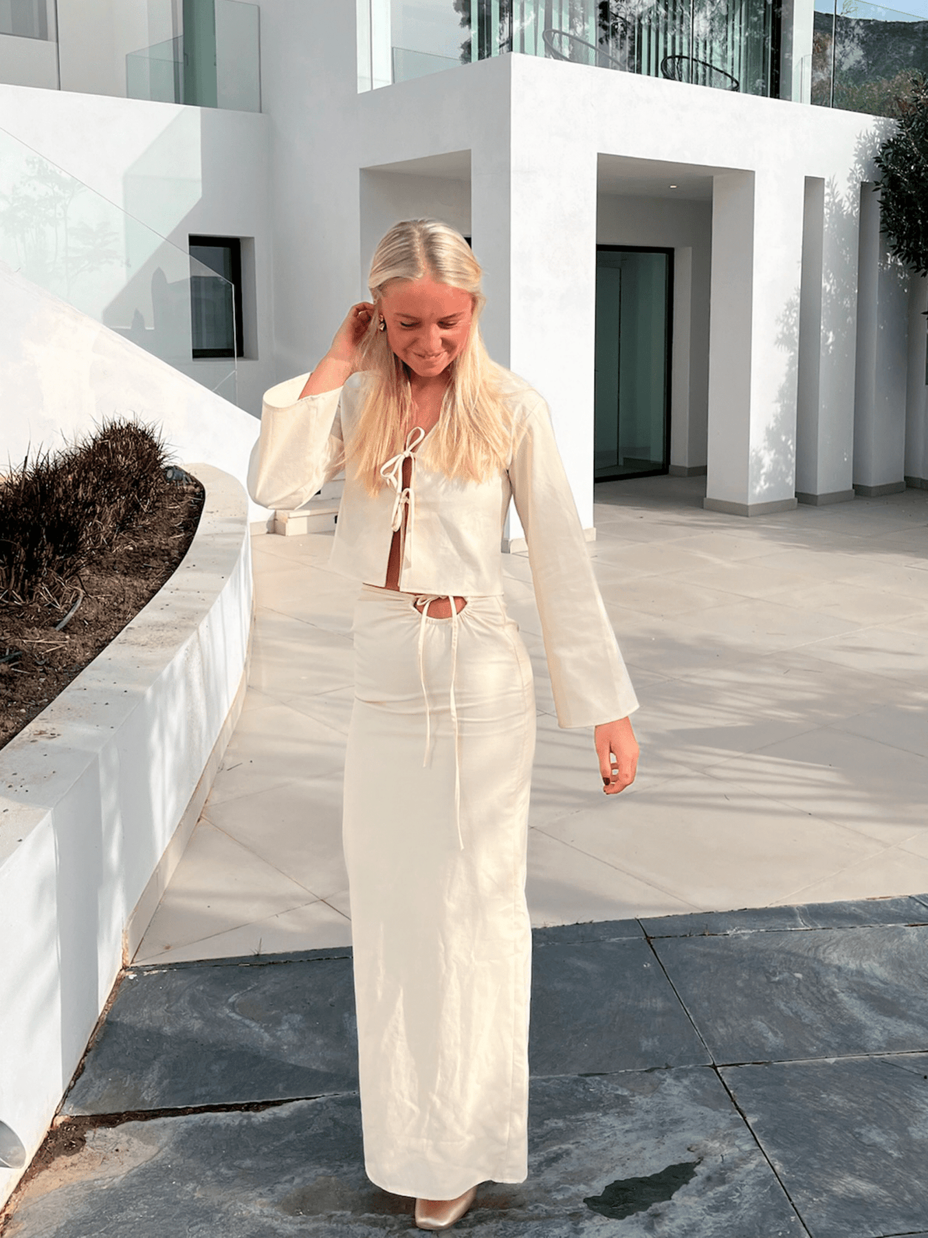 Fin cardigan med bindebånd langs fronten. Cardiganen er lavet i en hørblanding, der sikrer at den ikke er gennemsigtig. Cardiganen er et perfekt match til Line Skirt.