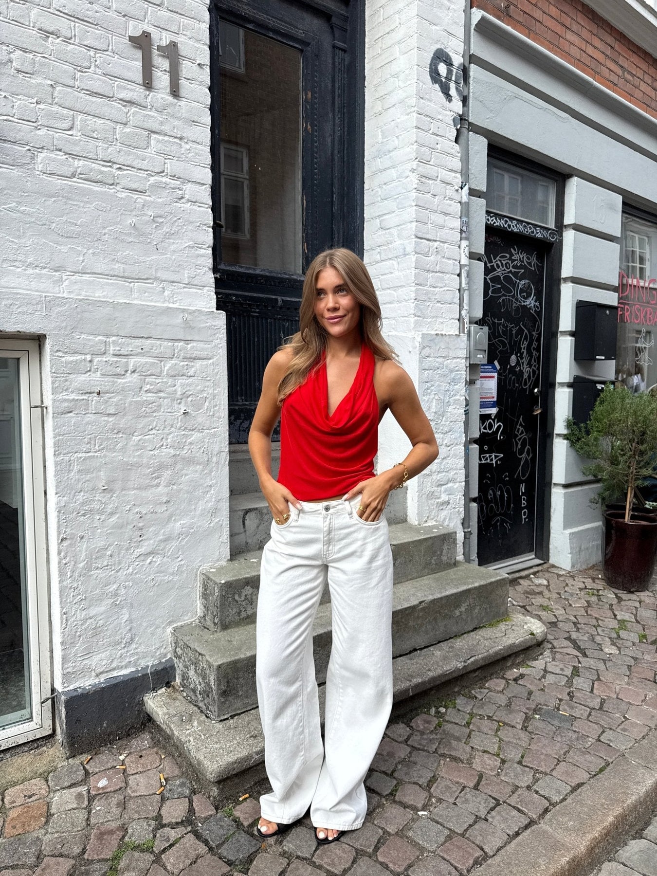 Gør dit outfit ekstra iøjnefaldende med denne smukke halterneck top i en smuk rød farve. Toppens front skaber en flot vandfaldseffekt, der giver et feminint og sofistikeret udtryk. Toppen har en åben og smuk ryg, hvilket giver et feminint look. Toppen har en kort, figursyet pasform, der balancerer perfekt mellem det elegante og det afslappede.