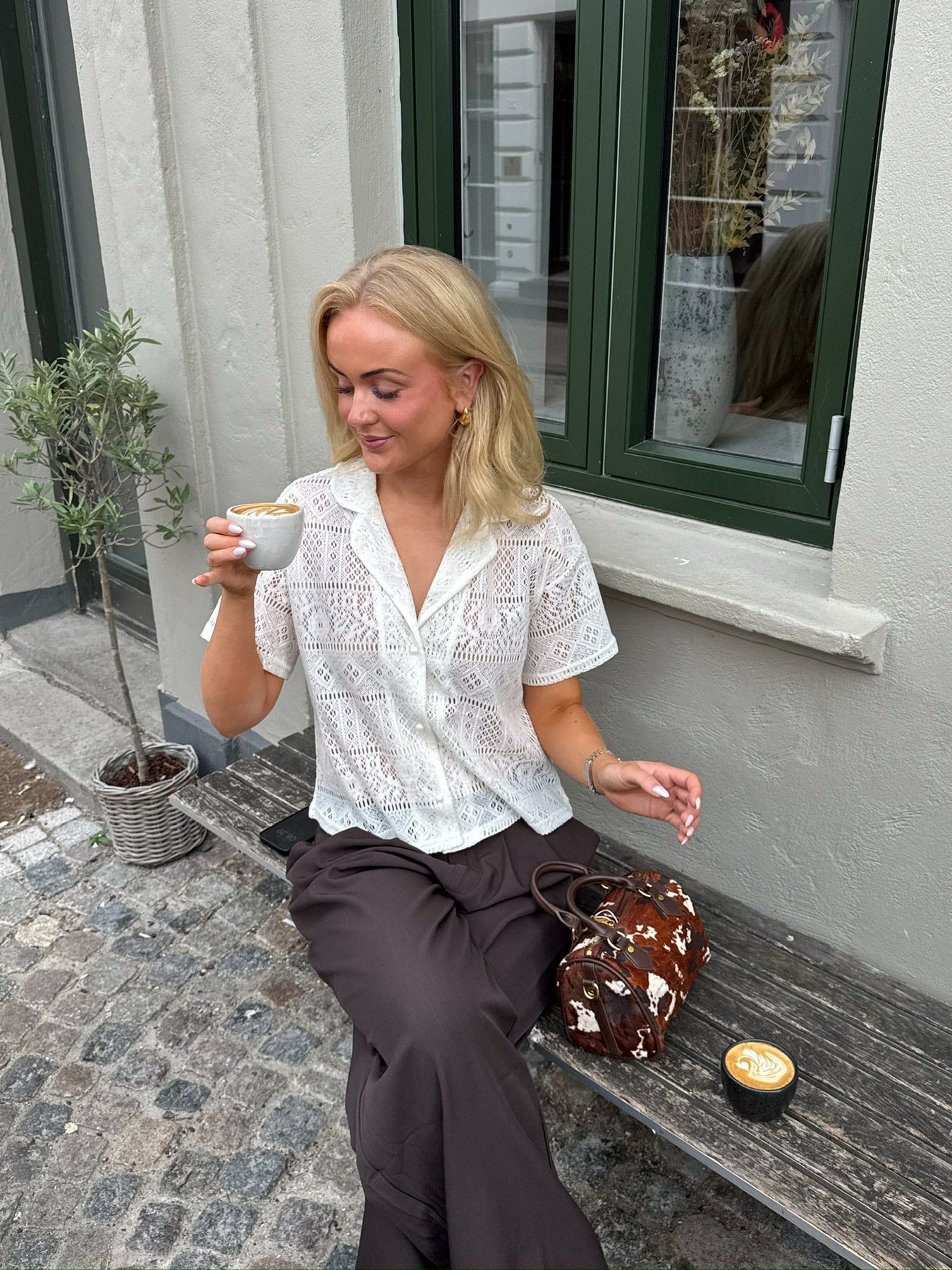 Den sorte hæklet skjorte er essensen af ubesværet sommerstil. Med sin gennemhullede struktur, korte ærmer og klassiske krave tilføjer den både kant og femininitet til dit outfit. Brug den åben over badetøjet på stranden eller knappet til et sofistikeret og luftigt hverdagslook.