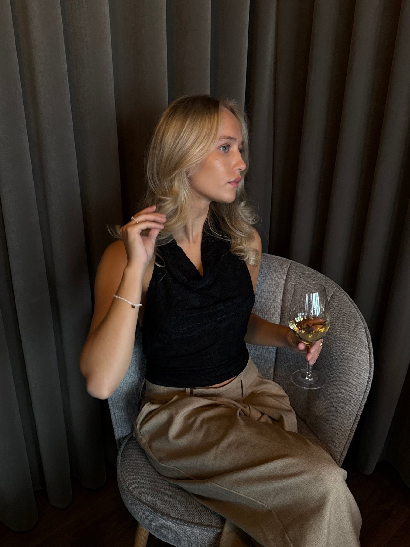 Elegant, feminin og nem at style – denne sorte halterneck-top er det perfekte valg til både hverdag og fest. Toppen har en front, der skaber et blødt og flatterende udtryk, mens det fine blondeinspirerede mønster tilføjer et romantisk touch.