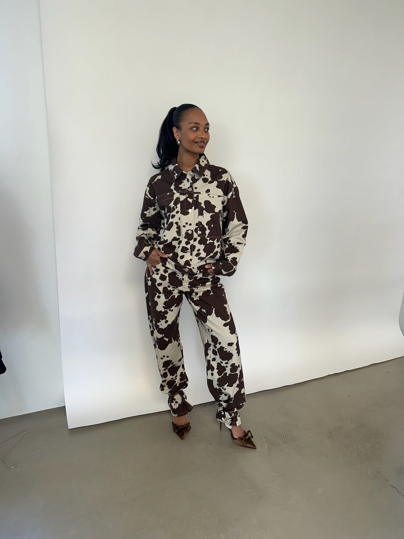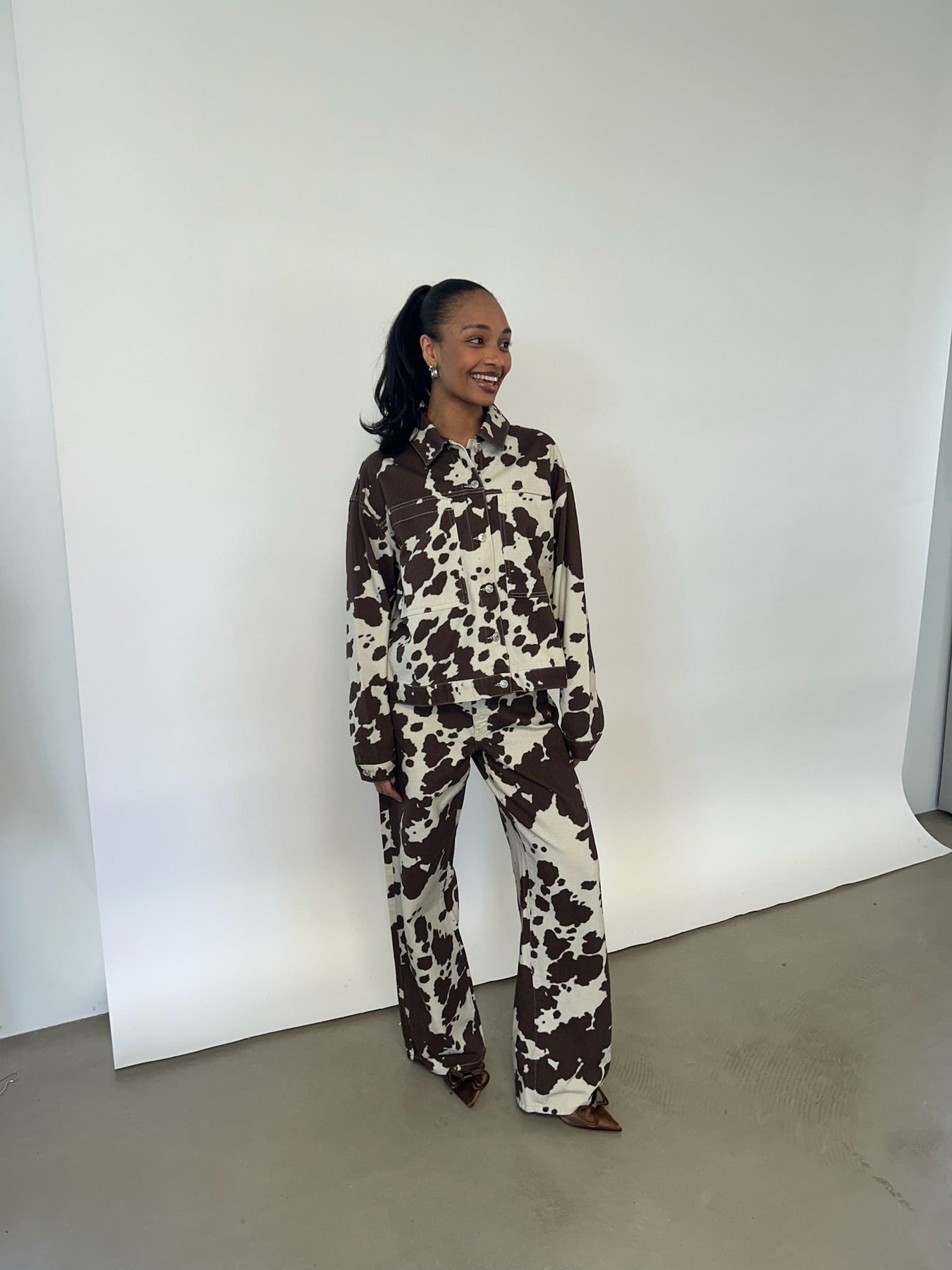 Sæt et statement med disse unikke cow print jeans, der bringer leg og attitude ind i din garderobe. Det brune og hvide mønster giver western vibes med et moderne twist, mens den afslappede pasform og det bløde materiale sikrer komfort dagen lang. Perfekte til dig, der tør skille dig ud og vil gøre dit outfit til noget helt særligt. For det ultimative look – kombiner dem med den matchende jakke.