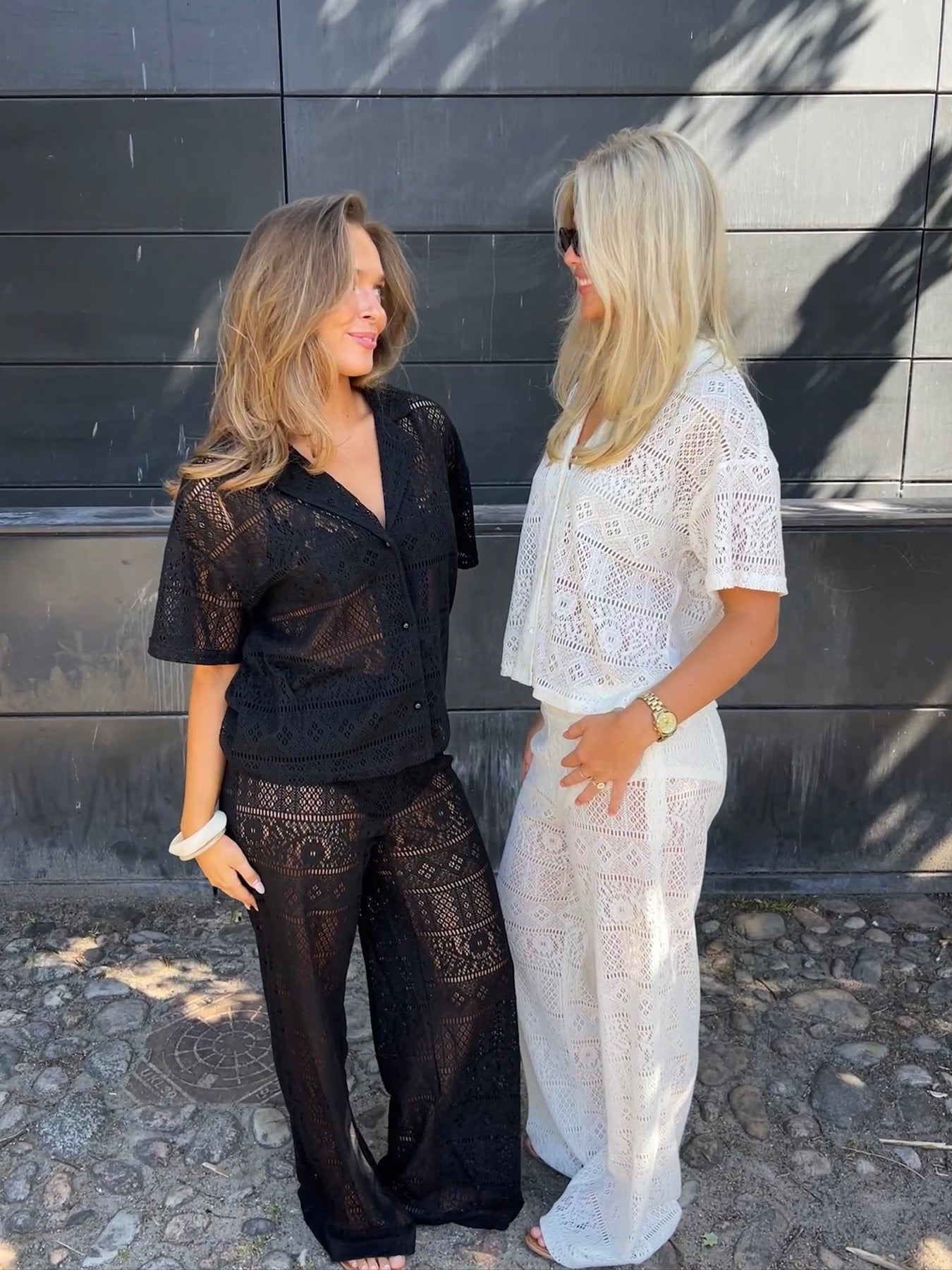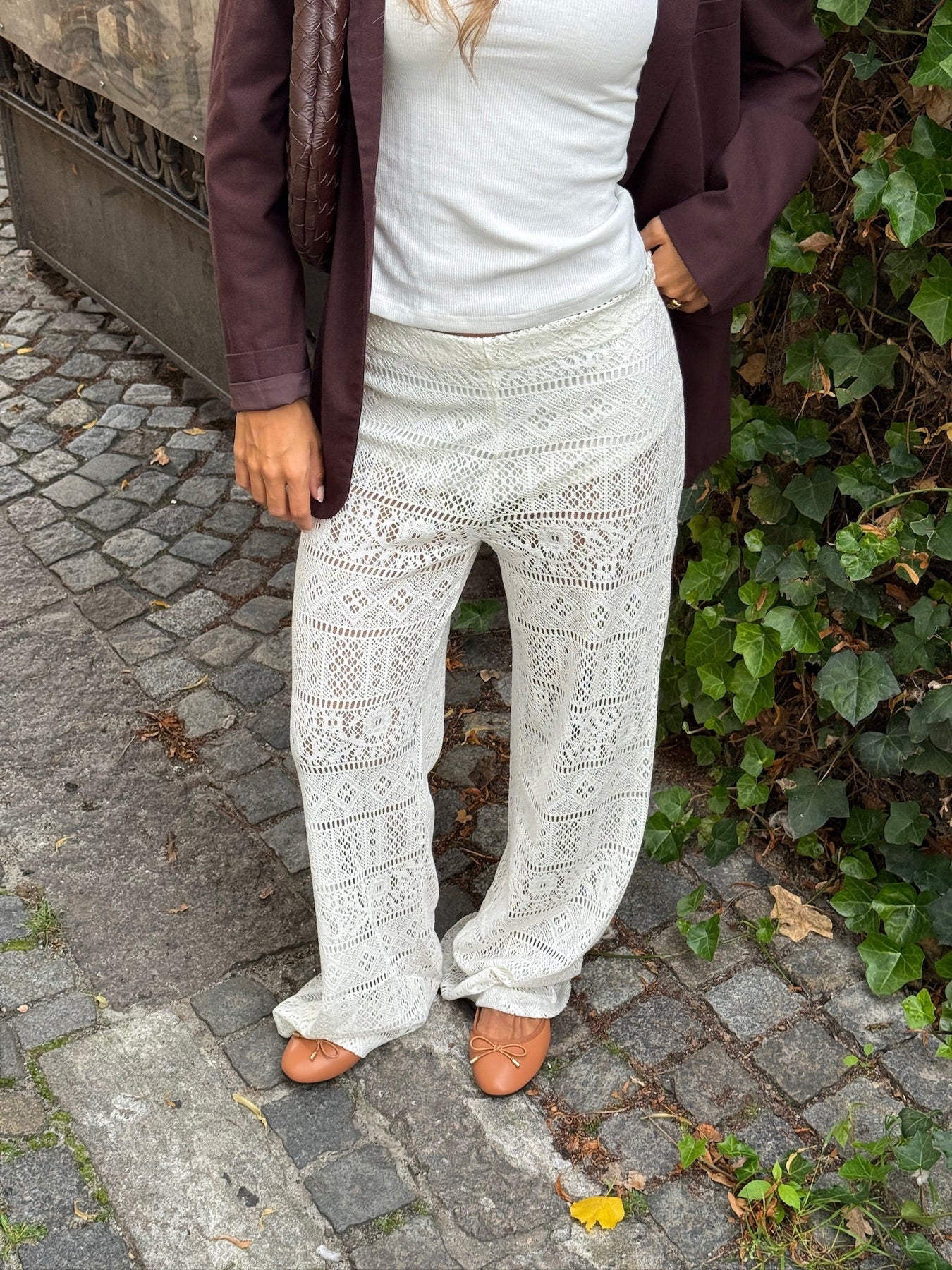 Disse elegante bukser i hvid hæklet materiale kombinerer komfort med raffineret sommerstil. Den transparente struktur giver et legende og luftigt udtryk, perfekt til både stranddage og afslappede bylooks. Brug dem over en bikini eller style dem med en skjorte og sandaler for et ubesværet, chic outfit.