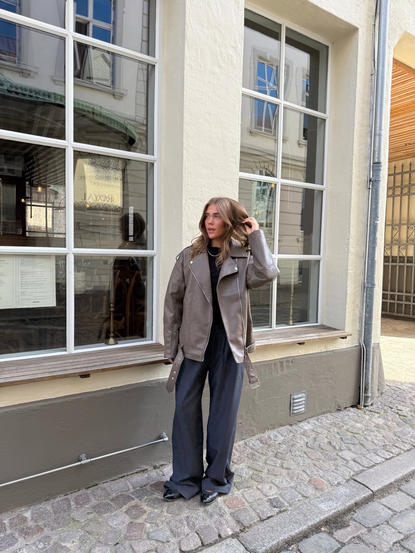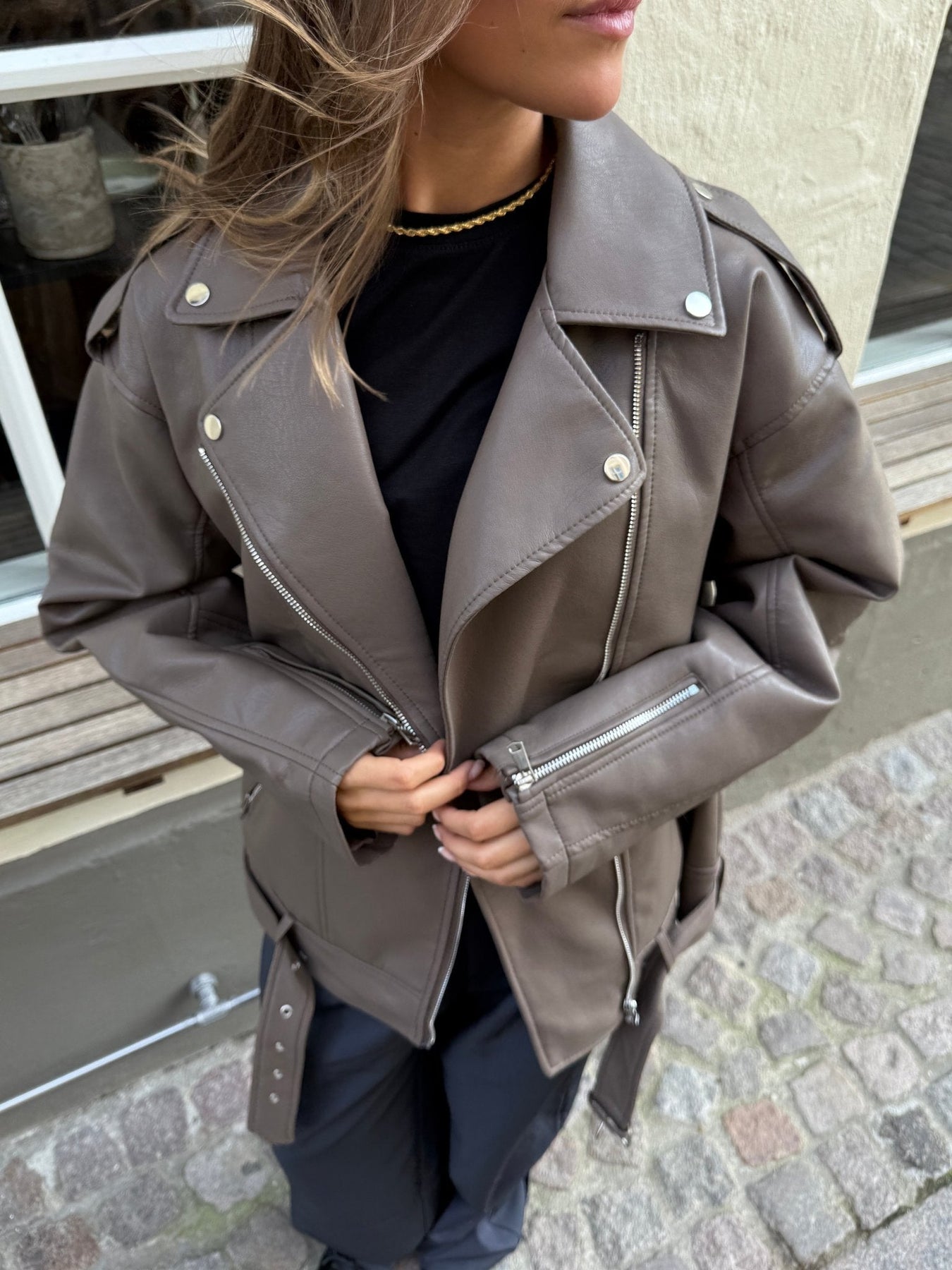 Tilføj kant og elegance til din garderobe med denne moderne bikerjakke i en sofistikeret brun farve. Jakkens materiale kombinerer struktur og blødhed for et eksklusivt udtryk. Dens mange sølv detaljer pifter jakkens udtryk op.