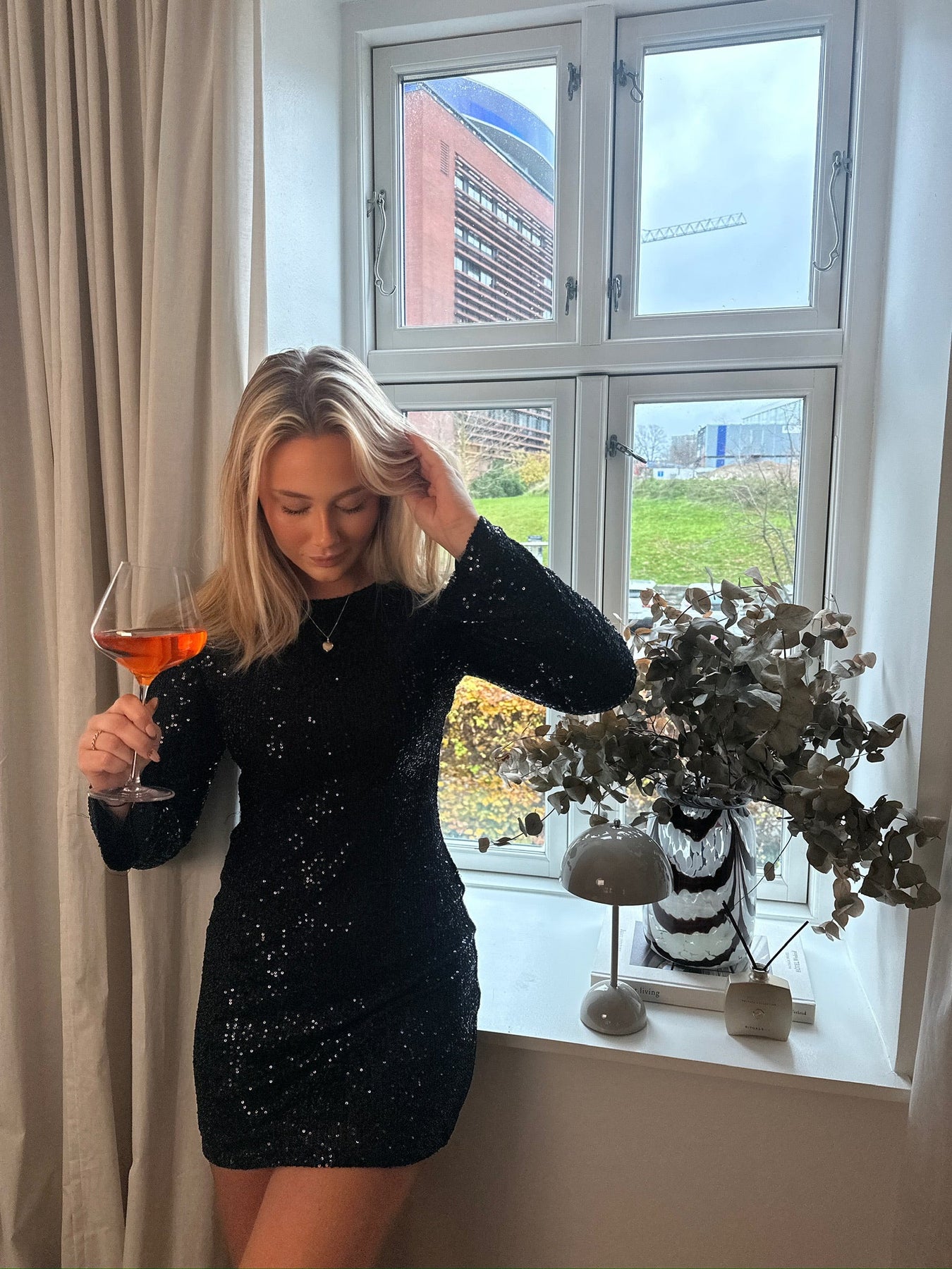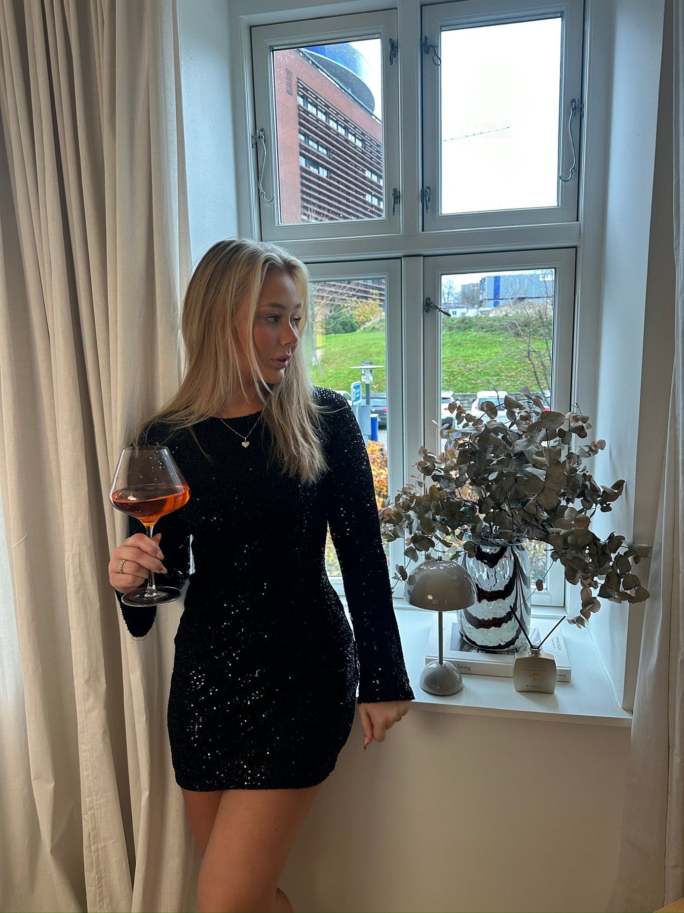 Pallietkjole med lange brede ærmer. Kjolen har en stram pasform. Kjolen er kort og har en lynlås bagpå.