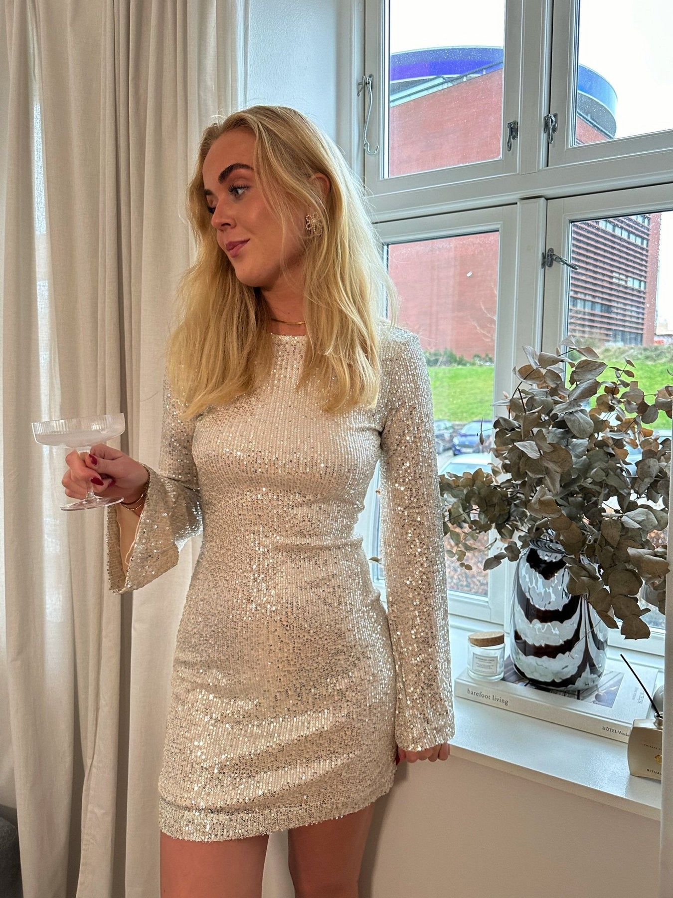 Pallietkjole med lange brede ærmer. Kjolen har en stram pasform. Kjolen er kort og har en lynlås bagpå.
