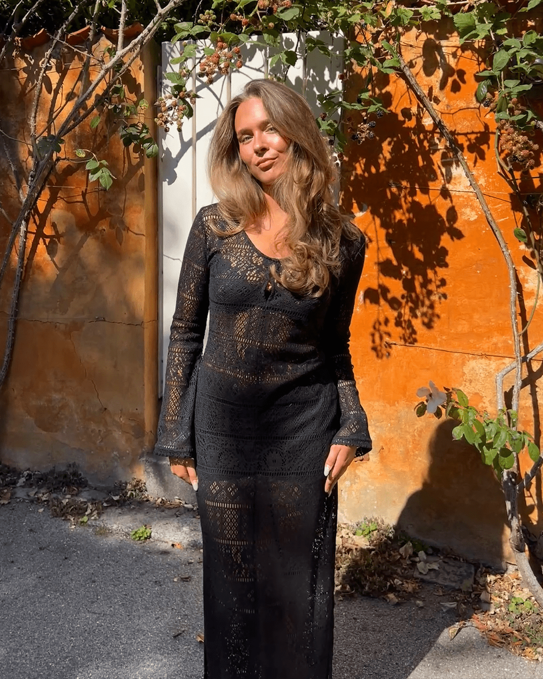 Den sorte hæklede maxikjole er en uimodståelig kombination af boheme og elegance. Med sin tætsiddende pasform, lange ærmer og smukke udskæringsdetalje ved halsen fremhæver den silhuetten på fineste vis. Kjolens transparente look gør den perfekt som strandkjole over badetøj eller til sommeraftener med et feminint touch.
