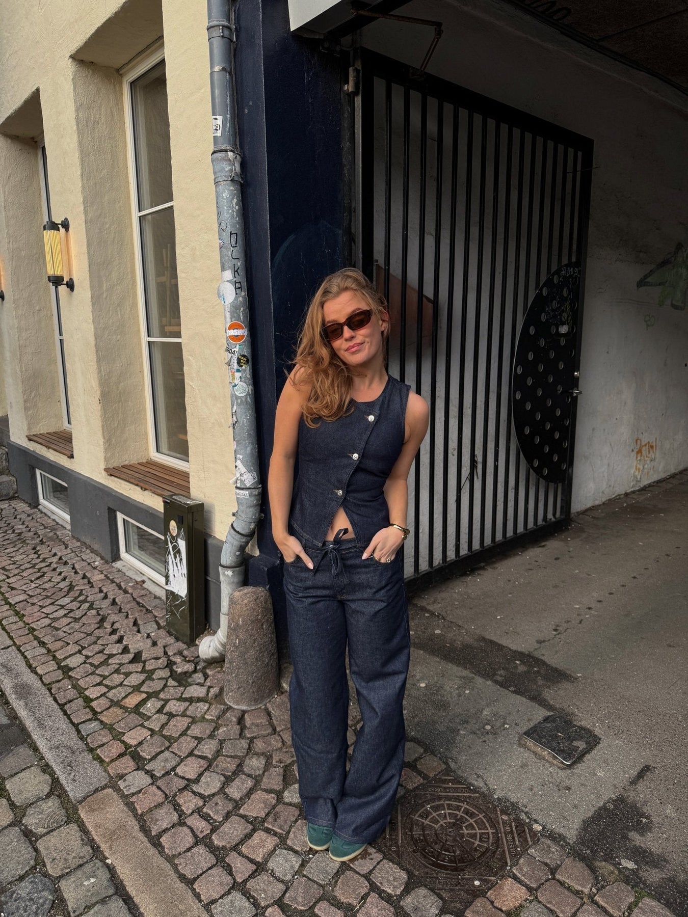 Vesten lukkes med en række stilfulde knapper hele vejen op, hvilket giver dig mulighed for at justere pasformen efter behov. De knapdetaljer tilføjer både funktionalitet og visuel interesse, mens den fine blå nuance og det luksuriøse materiale sikrer, at vesten kan styles til både hverdag og fest.