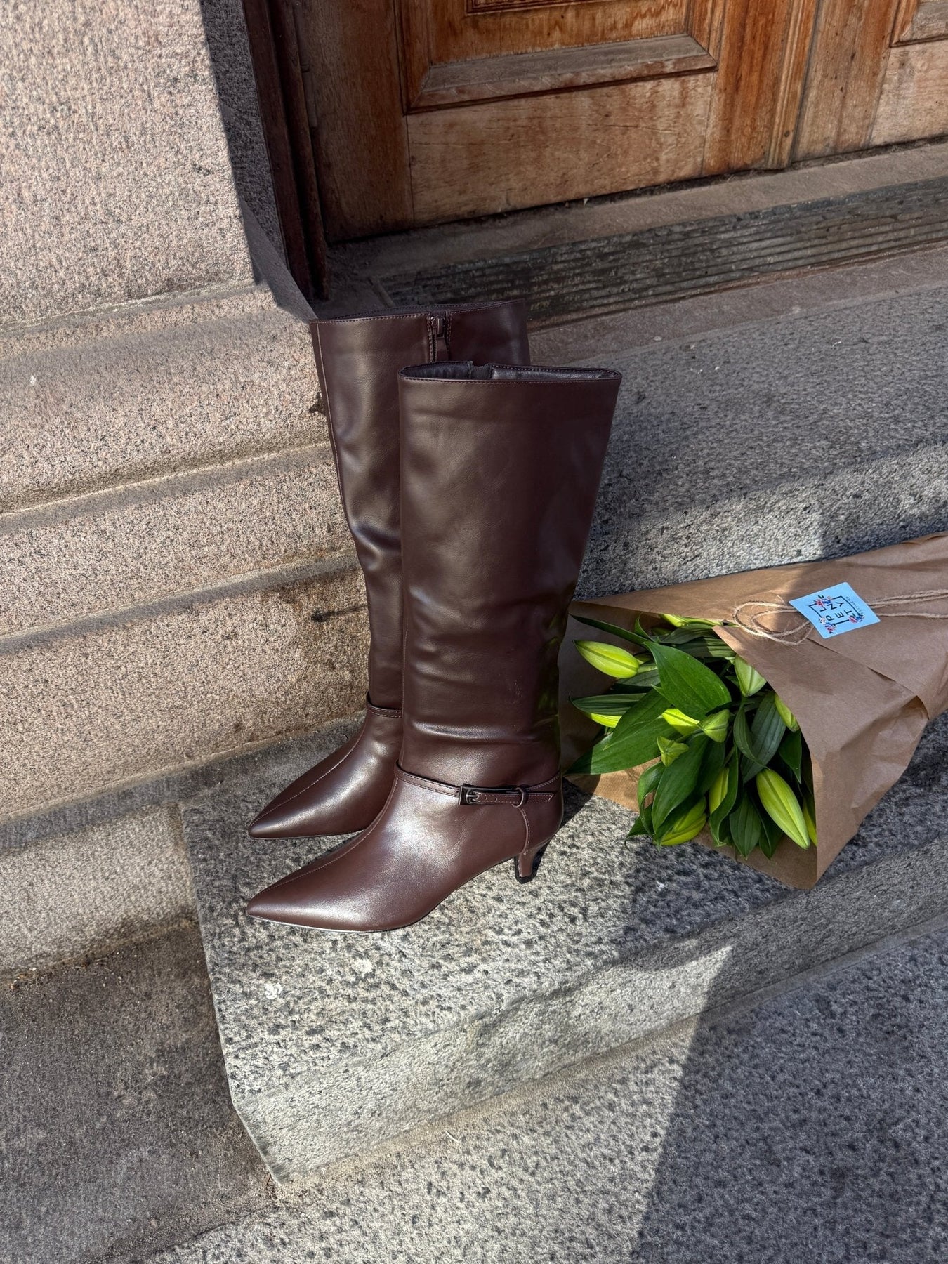 Tilføj et strejf af klassisk elegance til din garderobe med disse smukke knæhøje støvler i mørkebrunt læderlook.